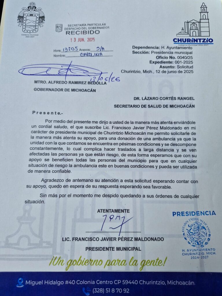 Churintzio, Mich. — Con el compromiso de mejorar los servicios de salud y atención a la población vulnerable, el presidente municipal de Churintzio, Francisco Javier Pérez Maldonado, anunció que, tras varios meses de gestiones, logró concretar la donación de una nueva ambulancia para el municipio.