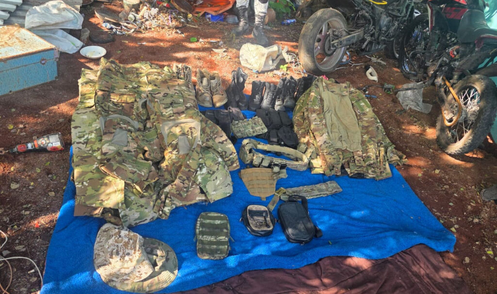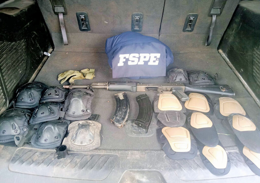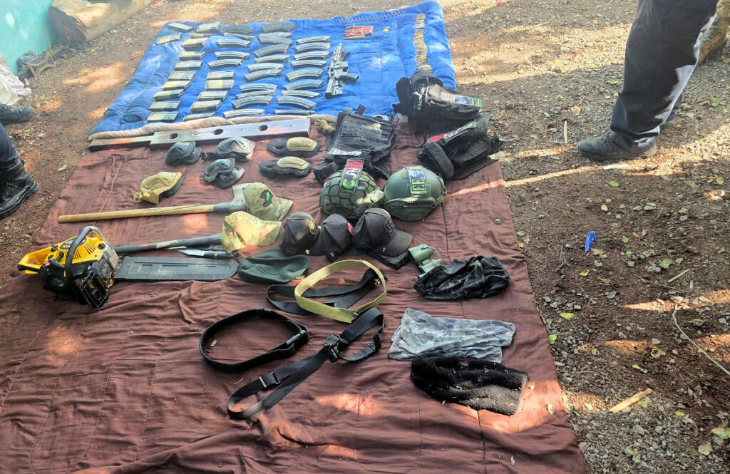 En el lugar, las autoridades aseguraron armas largas y cortas, más de 570 cartuchos, cargadores, chalecos, cascos y equipo táctico, así como un vehículo, hachas y una motosierra.