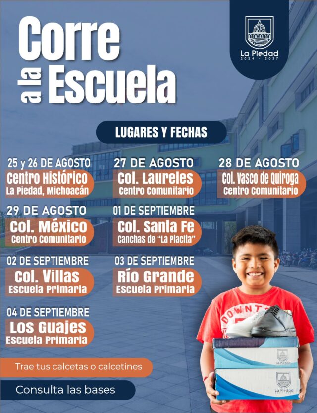El presidente municipal de La Piedad, Samuel Hidalgo, dió a conocer que por tercer año consecutivo se habilitará el programa “Corre a la Escuela”, donde se entregarán 8 mil pares de tenis y zapatos escolares gratuitos a niñas y niños de primaria, pertenecientes a escuelas públicas de la zona urbana y rural de la localidad.