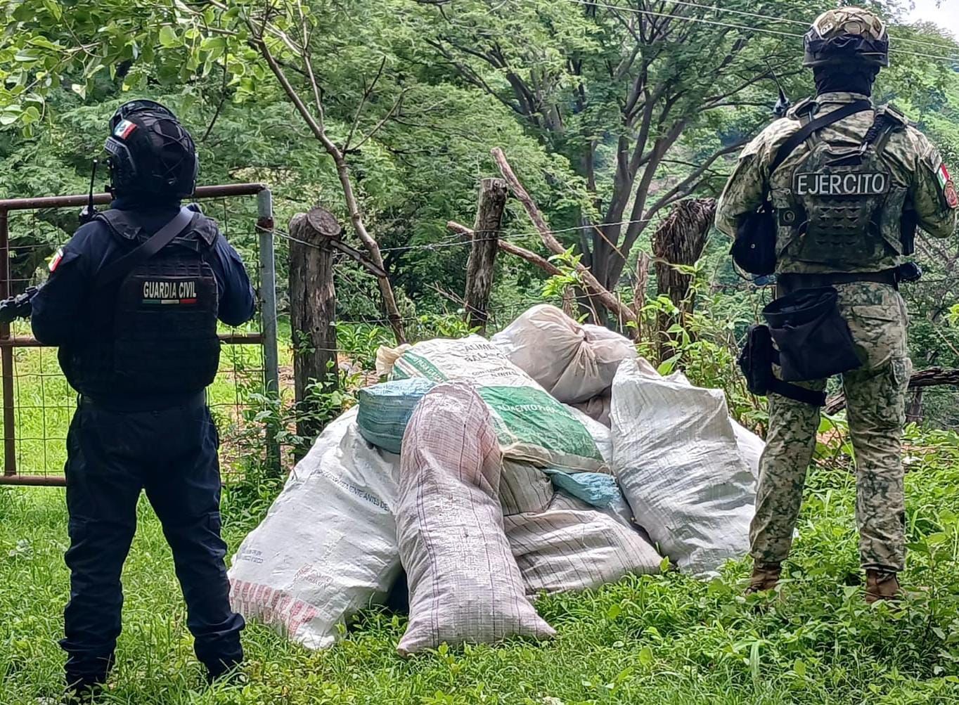 Los agentes de la Guardia Civil y del Ejército Mexicano localizaron en un camino de terracería dichos costales, mismos que tras una verificación oficial se constató que contenían el enervante ya mencionado, con un peso aproximado de 35 kilogramos.