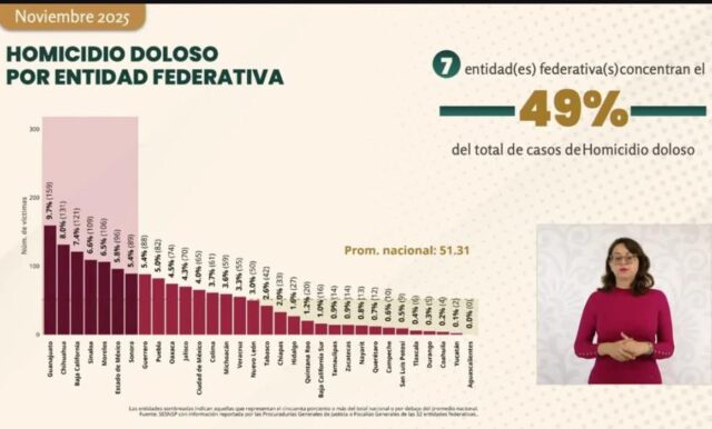 El informe también señaló que, aunque siete estados concentran casi la mitad de los homicidios dolosos del país, Michoacán logró mantenerse fuera de ese grupo por segundo mes consecutivo, consolidando una disminución sostenida.