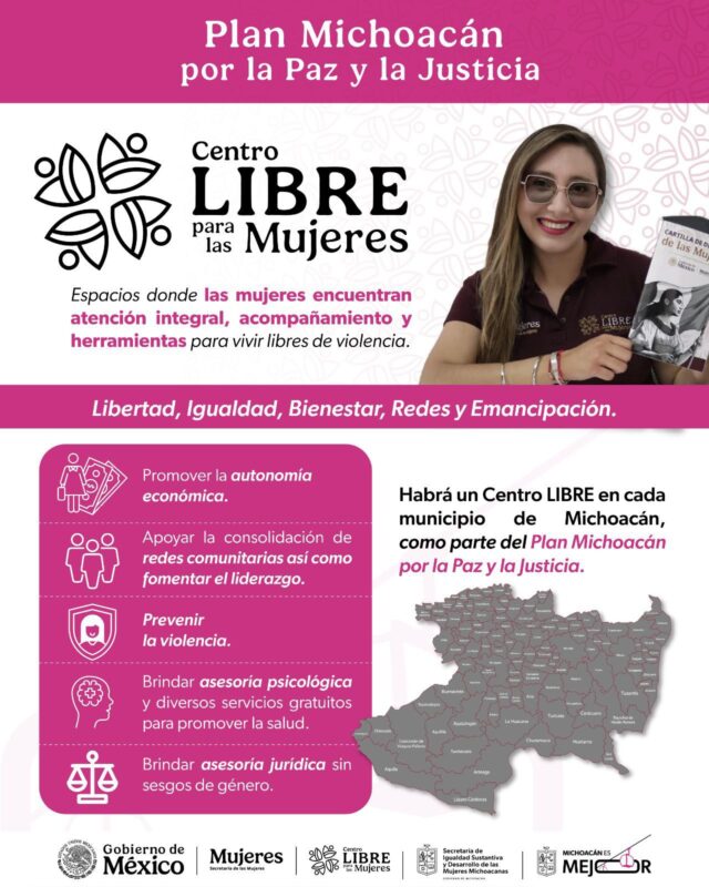 Morelia, Mich.- Como parte del Plan Michoacán por la Paz y la Justicia, impulsado por la presidenta de México, Claudia Sheinbaum Pardo, la Secretaría de Igualdad Sustantiva y Desarrollo de las Mujeres Michoacanas, encabezada por Alejandra Anguiano González, trabajará en la ampliación de la cobertura de los Centros LIBRE, con el objetivo de que cada municipio del estado cuente con uno de estos espacios dedicados a la atención integral de las mujeres.