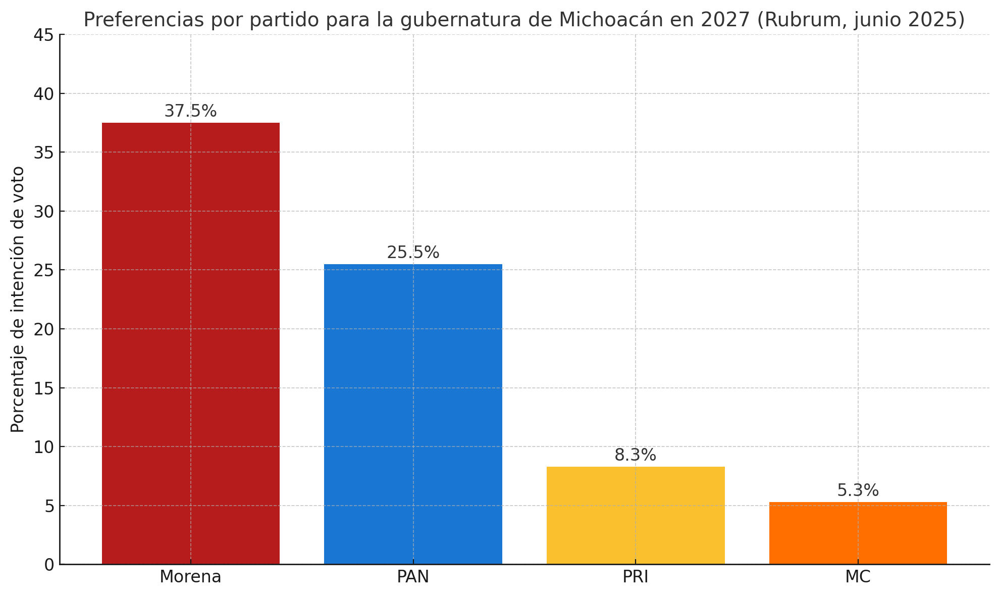 En tanto, Rubrum, con estudios de mayo y junio de 2025, reporta que Morena mantiene una intención de voto entre 37.5 % y 39.0 %, PAN entre 25.5 % y 27.0 %, y el PRI por debajo del 9 %. Movimiento Ciudadano, en el mismo rango, se ubica entre 3.8 % y 5.3 %.