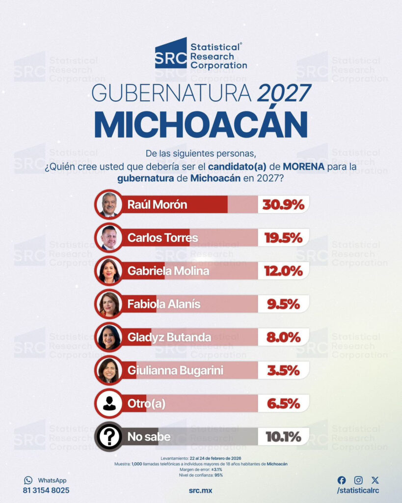 A poco más de un mes para que Morena defina su candidatura hacia la gubernatura de Michoacán en 2027, las encuestas reflejan un escenario de clara ventaja para el senador Raúl Morón Orozco, así lo muestra el más reciente estudio de Statistical Research Corporation (SRC), en donde el profesor se mantiene firme en la cima de las preferencias ciudadanas con una ventaja de doble dígito.