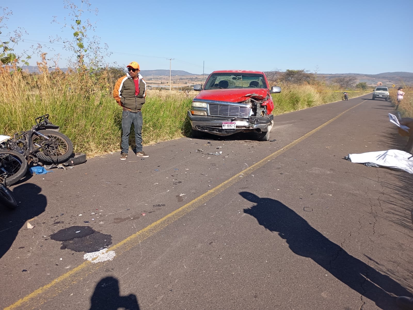 La víctima fue identificada como Juan Antonio C., de 21 años de edad, quien conducía una motocicleta que quedó completamente destruida a un costado de la carretera luego de ser impactada por una camioneta pick up roja con placas del estado de Michoacán.
