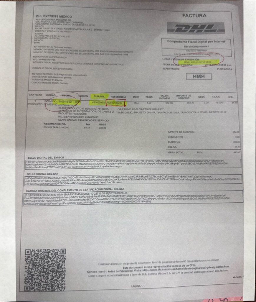 En el caso del municipio de La Piedad, la documentación solicitada por la ASF fue enviada dentro del término establecido mediante servicio de mensajería especializada. La entrega quedó respaldada con la guía de envío 4314009615 de la empresa DHL, documento que acredita la remisión de la información por parte del Ayuntamiento.