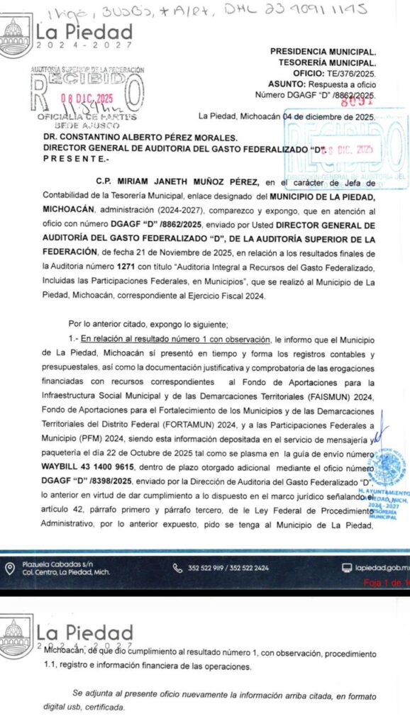 Asimismo, mediante oficio con fecha 4 de diciembre de 2025, se solicitó al Director General de Auditoría del Gasto Federalizado que se tenga al Municipio de La Piedad como un ente público que cumplió en tiempo y forma con la entrega de los registros contables, presupuestales y la documentación justificativa y comprobatoria solicitada por la ASF.