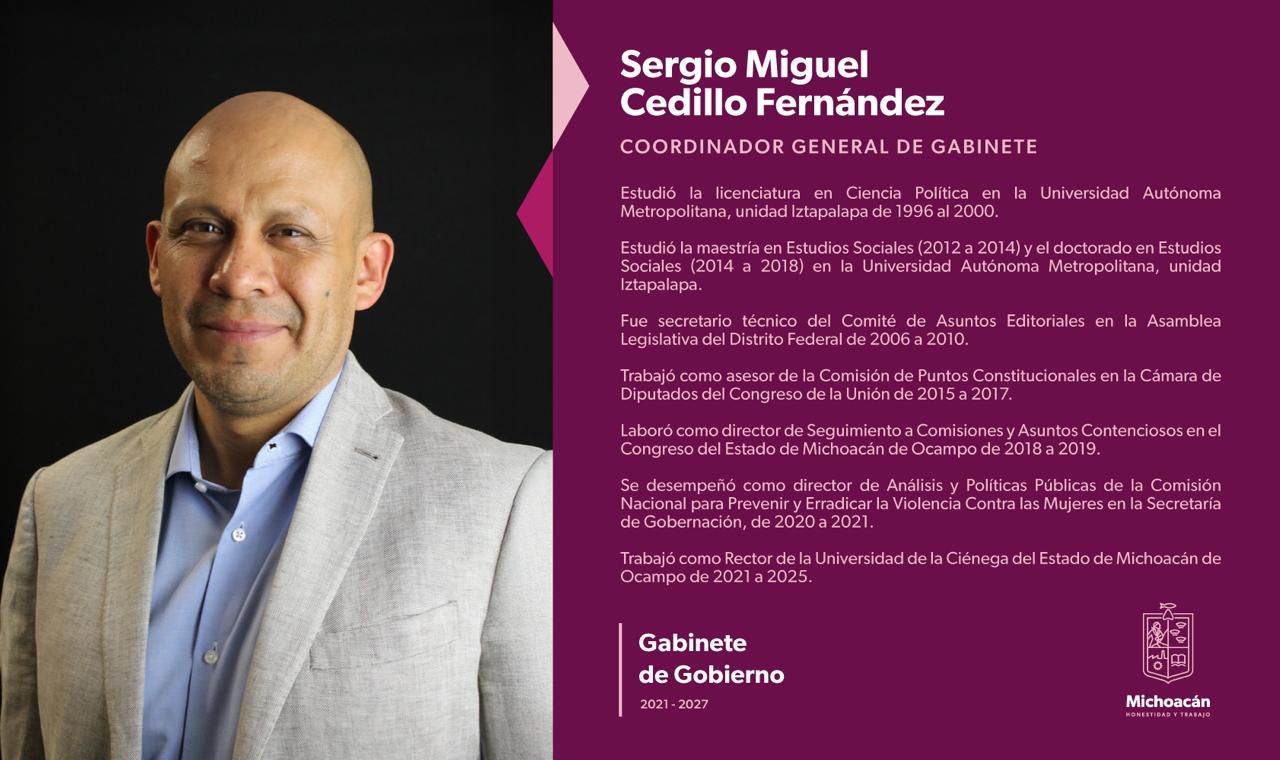 Morelia, Mich.- El gobernador Alfredo Ramírez Bedolla nombró a Sergio Miguel Cedillo Fernández como coordinador general de Gabinete.
