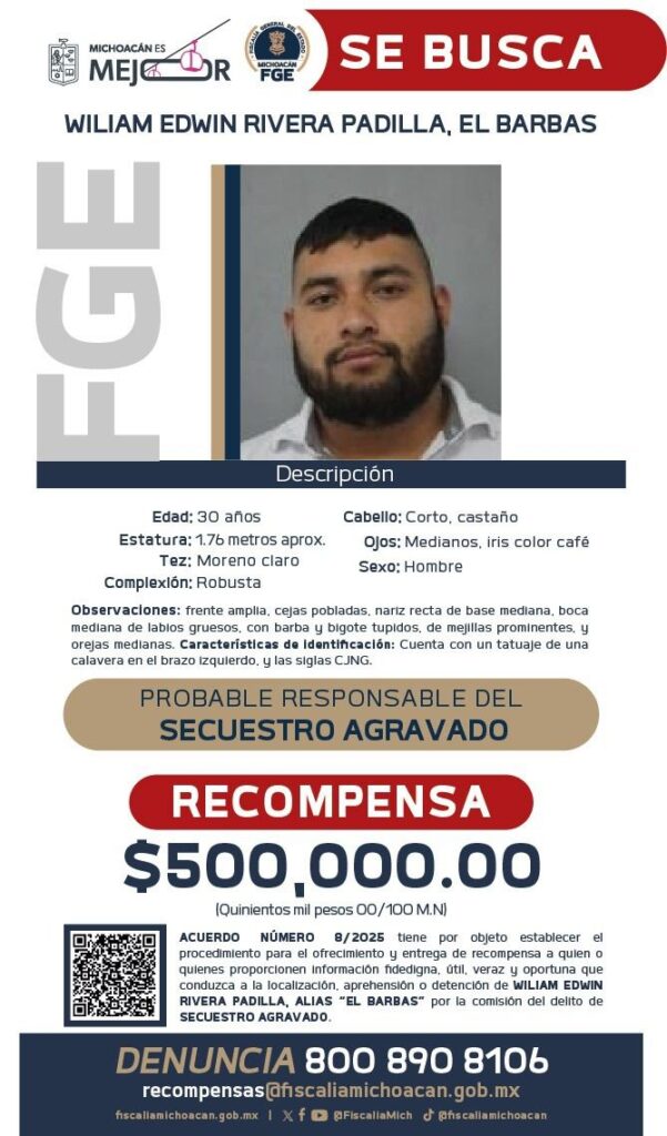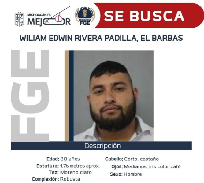 Morelia, Mich.– Como resultado de los trabajos de investigación que lleva a cabo la Fiscalía General del Estado de Michoacán (FGE), se logró establecer la presunta responsabilidad de William Edwin Rivera Padilla, el Barbas, en el delito de secuestro agravado, por lo que se ha emitido acuerdo de ofrecimiento de recompensa para quien proporcione información veraz y útil que conduzca a su detención.