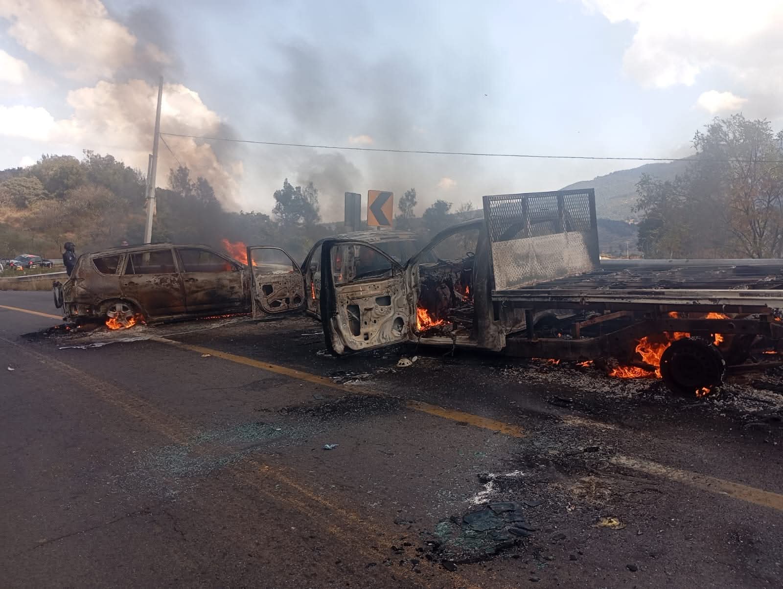 Durante la jornada también se reportaron bloqueos carreteros y la colocación de vehículos atravesados en distintos municipios cercanos, acciones que autoridades atribuyen a reacciones del crimen organizado ante los operativos.