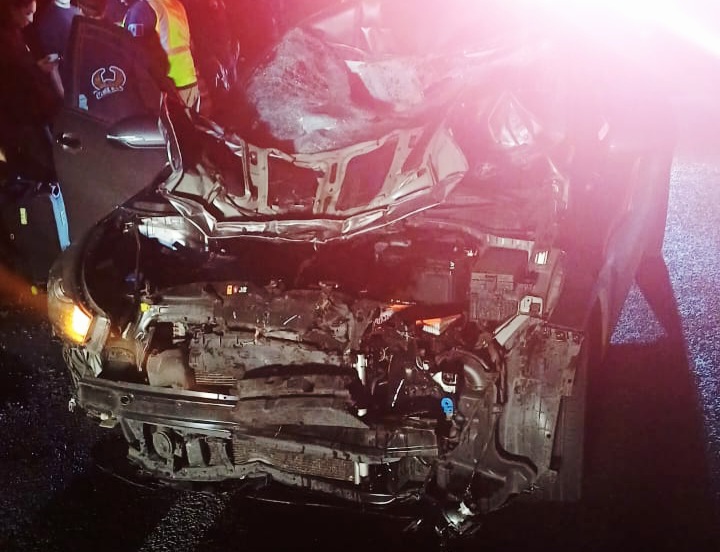 El vehículo involucrado es un KIA Río, color gris, el cual quedó completamente averiado. El animal fue localizado sobre la carpeta asfáltica tras el incidente.