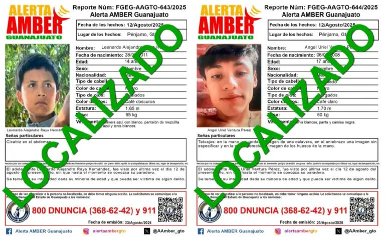 Los menores fueron identificados como Leonardo Alejandro Raya Hernández, de 14 años, y Ángel Uriel Ventura Pérez, de 17 años, quienes habían sido buscados bajo el protocolo de la Alerta Amber, activada por la Fiscalía General del Estado de Guanajuato.