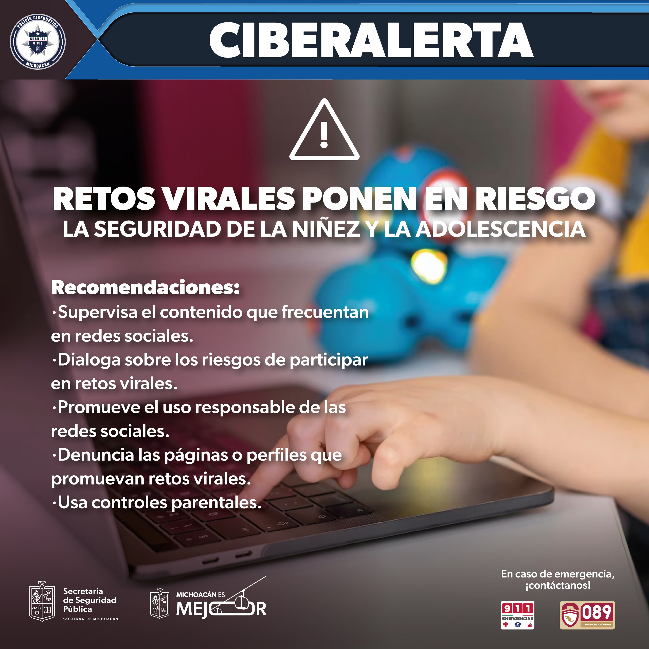 En este tenor, los efectivos especializados alertan de los peligros a los que se puede exponer la niñez y adolescencia michoacana, derivado de diversos retos virales que hay en las distintas redes sociales, por lo que brinda las siguientes recomendaciones: