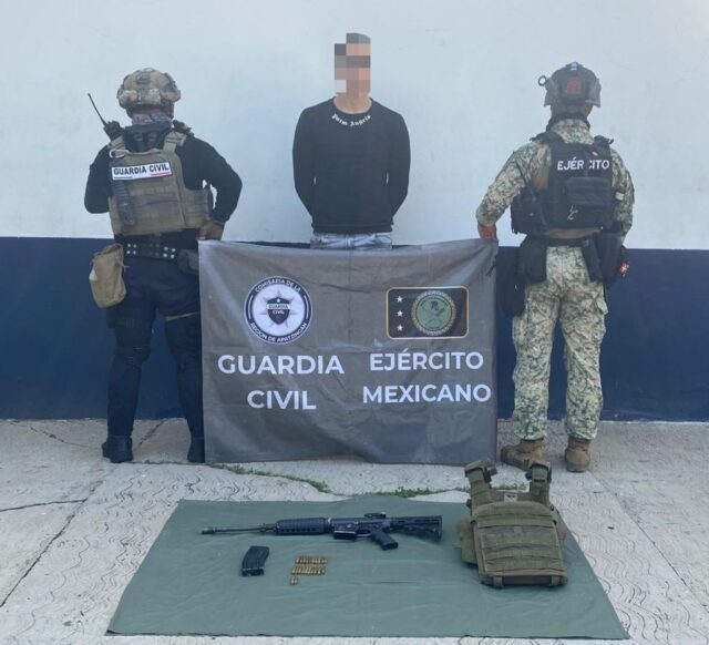 Al extranjero le fue decomisado el fusil multicalibre con un cargador y 22 municiones para calibre 5.56 milímetros; también le aseguraron un chaleco balístico y se presume su presunta participación en un grupo delincuencial que opera en la región.