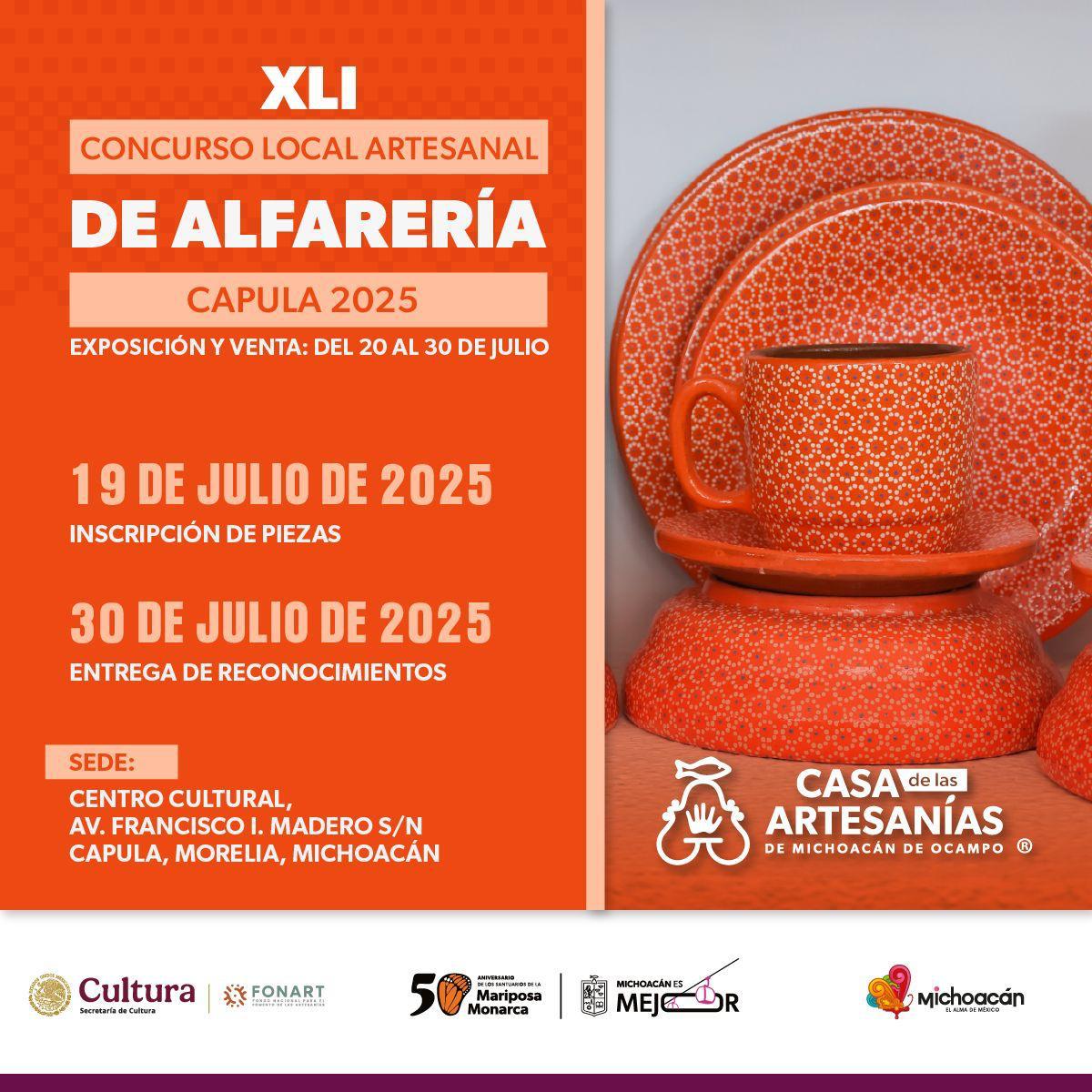 Del 20 al 30 de julio, el sector artesanal de Capula tendrá a la venta sus mejores piezas como vajillas, juegos de té y agua, lámparas, floreros centros de mesa, entre otras piezas de alfarería tradicional sin plomo y alta temperatura, además de miniaturas que sorprenderán a todos los visitantes y que podrán adquirir en el Centro Cultural de este lugar.